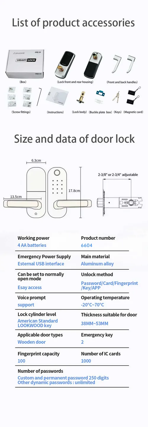 Unlocking Method | Wi-Fi/Fingerprint/IC Card/Password/Key |